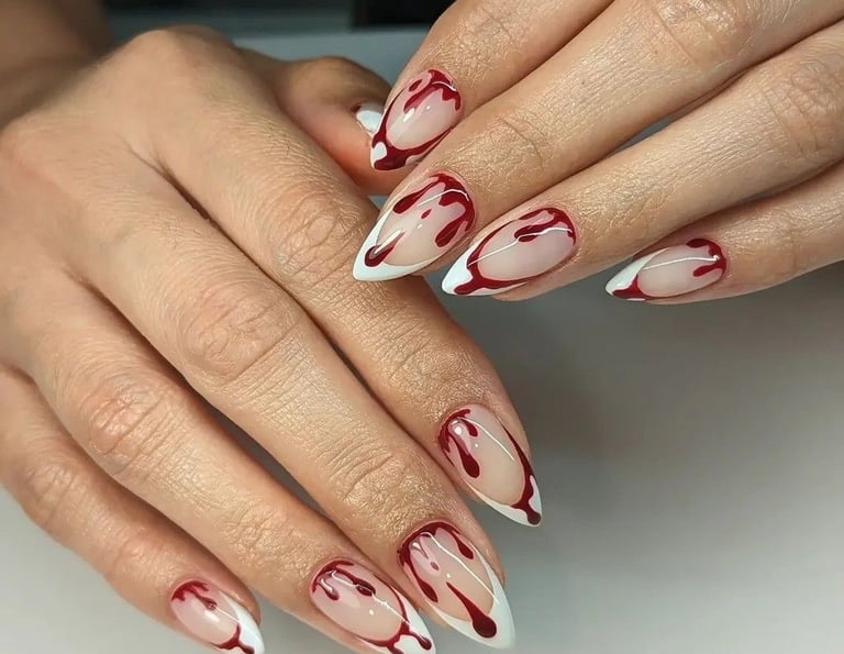 A twisted take on the classic French manicure, bloody French tips are one of the most pinned Halloween nail designs this year. They start with a clean nude or sheer base, finished with deep red, drip-like polish that looks like blood — perfect for vampire, zombie, or horror-themed aesthetics.