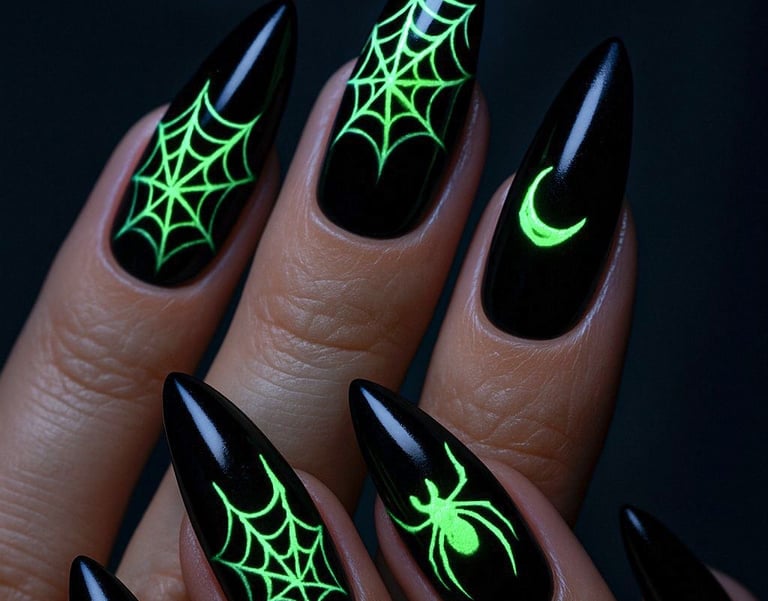 Designers are layering neon green, white, or purple glow polish over matte black bases, adding intricate spider web detailing using fine nail art brushes. When the lights go out, these nails steal the show — making them perfect for Halloween parties.