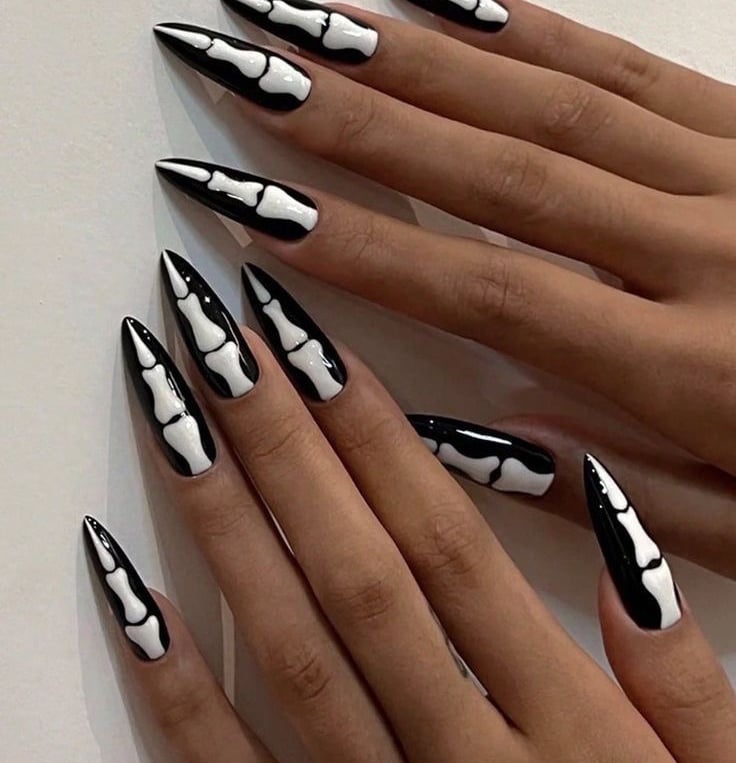 No Halloween list is complete without skeleton nails. In 2025, the trend has evolved into sleek minimalist bone outlines on a matte black base, or 3D skeleton effects using white chrome powder. The contrast is bold, haunting, and incredibly detailed.