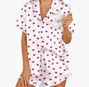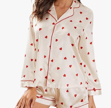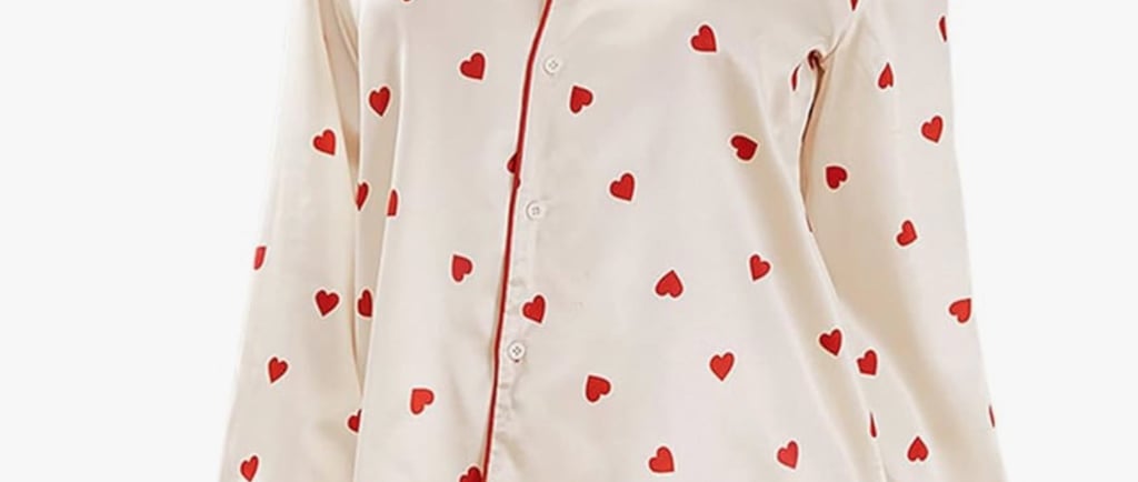 Heart prints and Valentine’s Day go hand in hand, and this RUEWEY set delivers the full theme. The long sleeves and button-down style make it cozy while still feeling stylish. For Galentine’s, it’s perfect for matching group photos and themed pajama parties. For couples, the heart print adds a playful, loving touch that feels festive without being over-the-top.